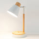 Deze bureaulamp combineert een witte metalen lampenkap met een houten voet en staander. Het strakke ontwerp past in uiteenlopende interieurstijlen. De lamp is geschikt voor LED- of Edisonlampen met een E26- of E27-fitting en eenvoudig te bedienen via een drukknopschakelaar.