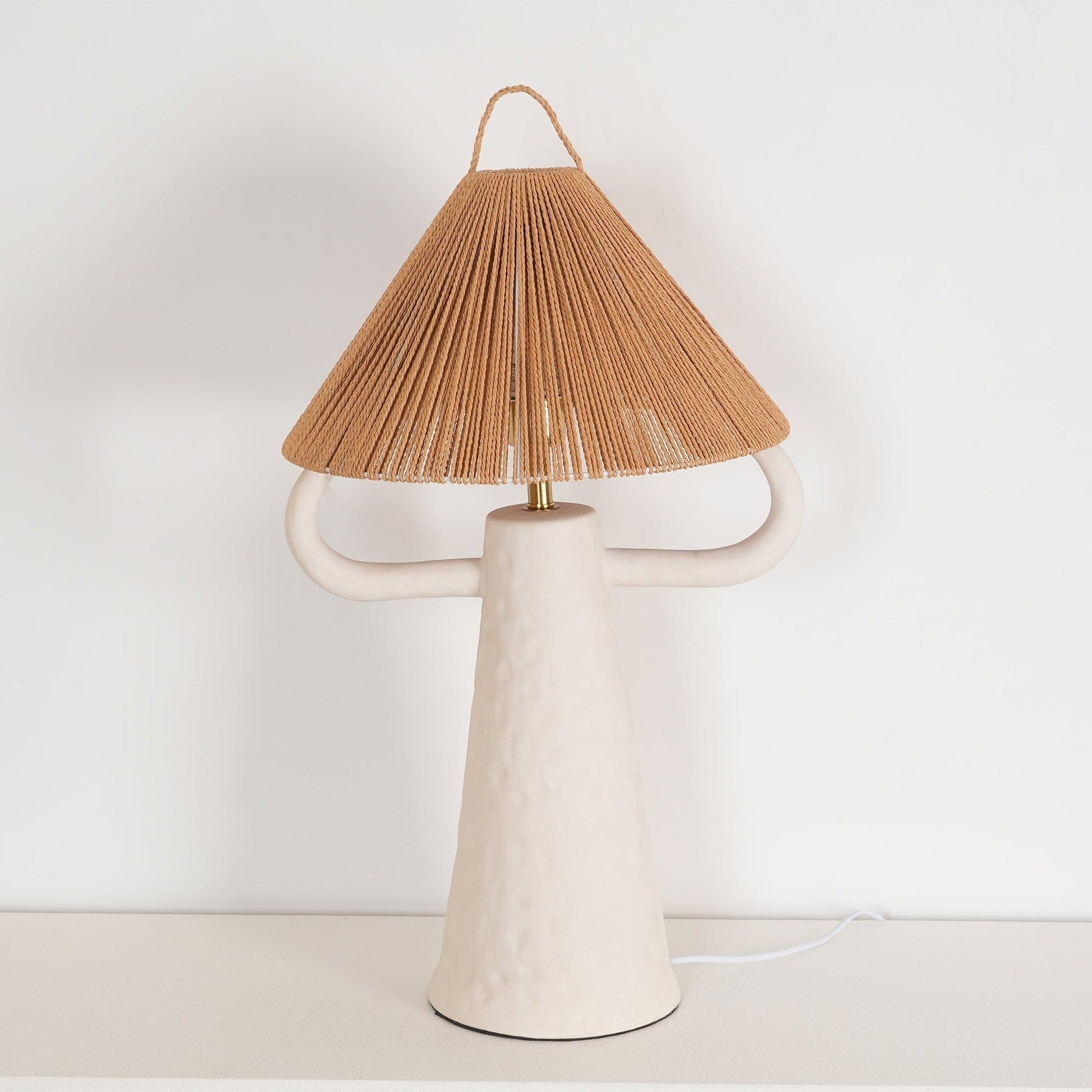 Deze tafellamp is gemaakt van keramiek en voorzien van een lampenkap van raffia. De combinatie van materialen geeft de lamp een natuurlijke uitstraling en maakt haar geschikt voor gebruik in uiteenlopende interieurs. De lamp kan eenvoudig worden gebruikt met standaard E27 lichtbronnen en is daardoor praktisch inzetbaar in woonkamers, slaapkamers of op bureaus.